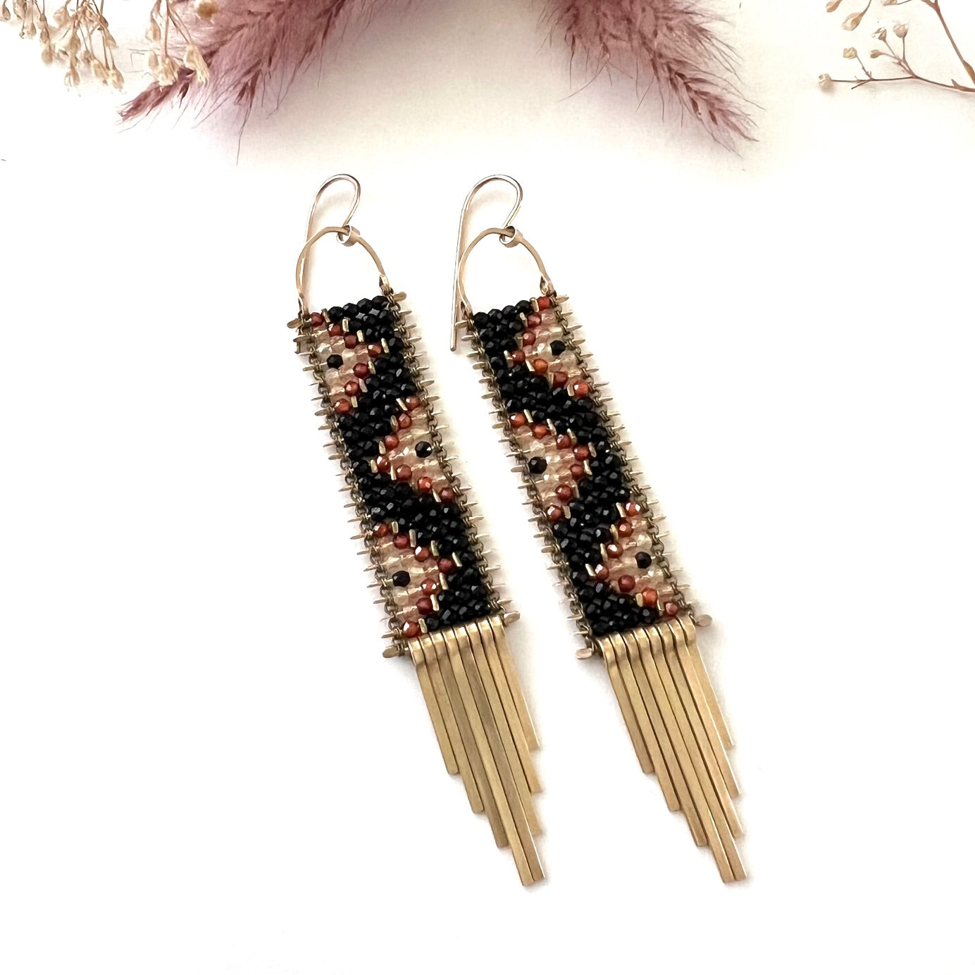 Fiery Carnelian, Peach Quartz and Black Onyx beaded in an asymmetrical pattern with 14k Gold Filled Ear wires and brass fringe.