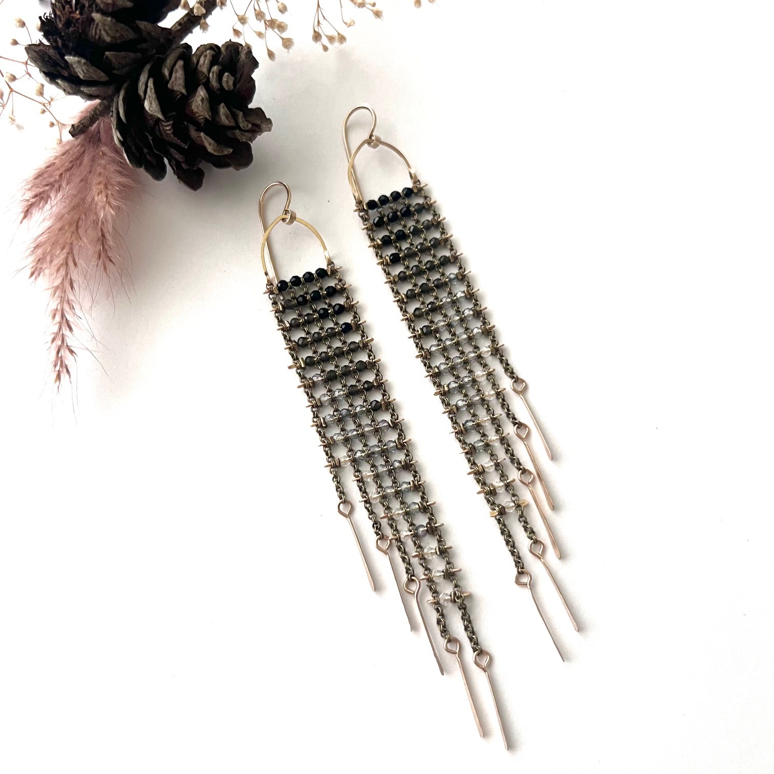 Long and elegant ombre beaded gemstones on antiqued brass chain. Onyx, Smokey Quartz, Grey Zircon and clear Quartz are used in this elegant beaded pattern. 14k gold filled ear wires, arches and hand hammered tassels.