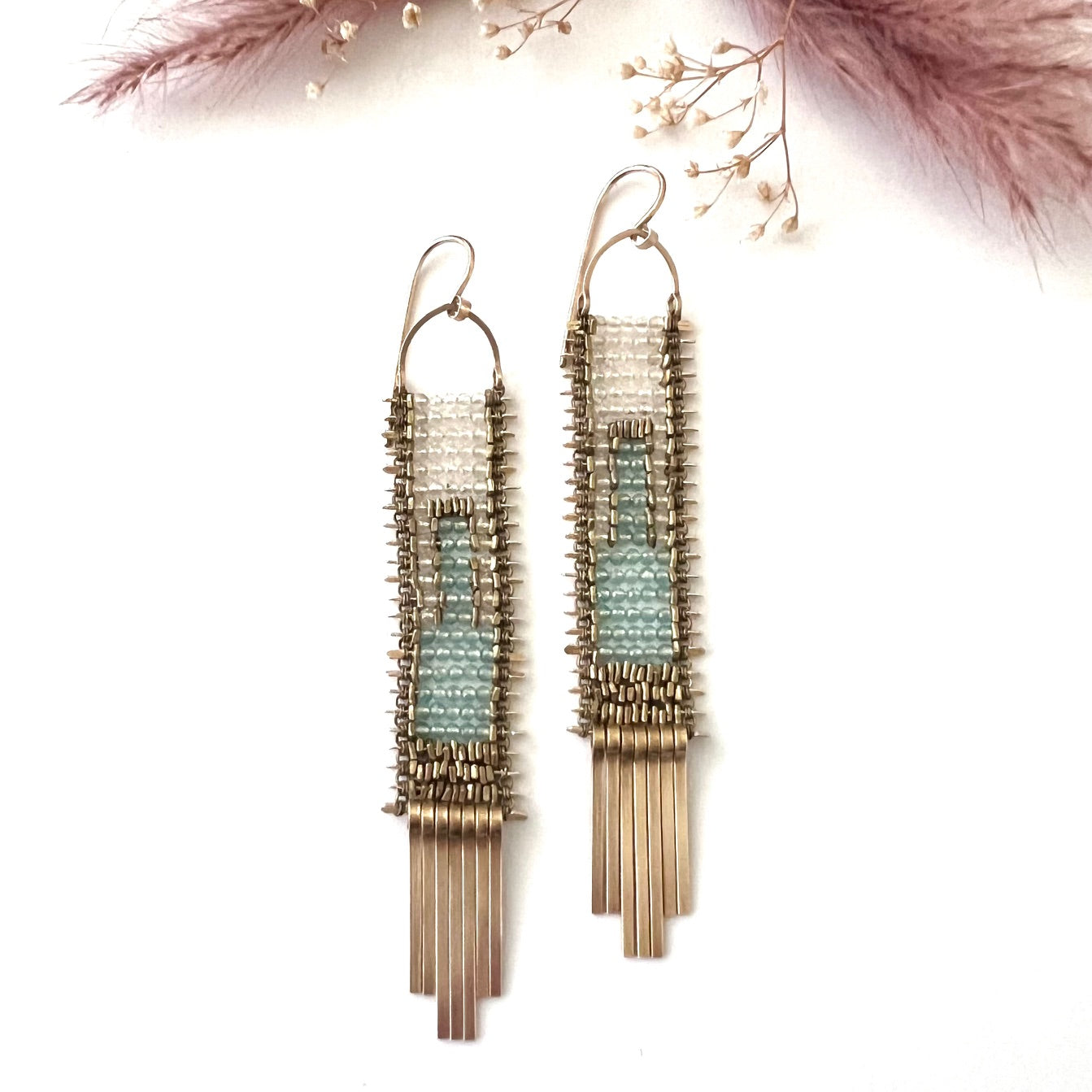 Clear and Pale Blue quartz in an intricate pattern accented with brass beads. Long and stunning. Delicate and elegant ... perfect for that Bride looking for something blue.