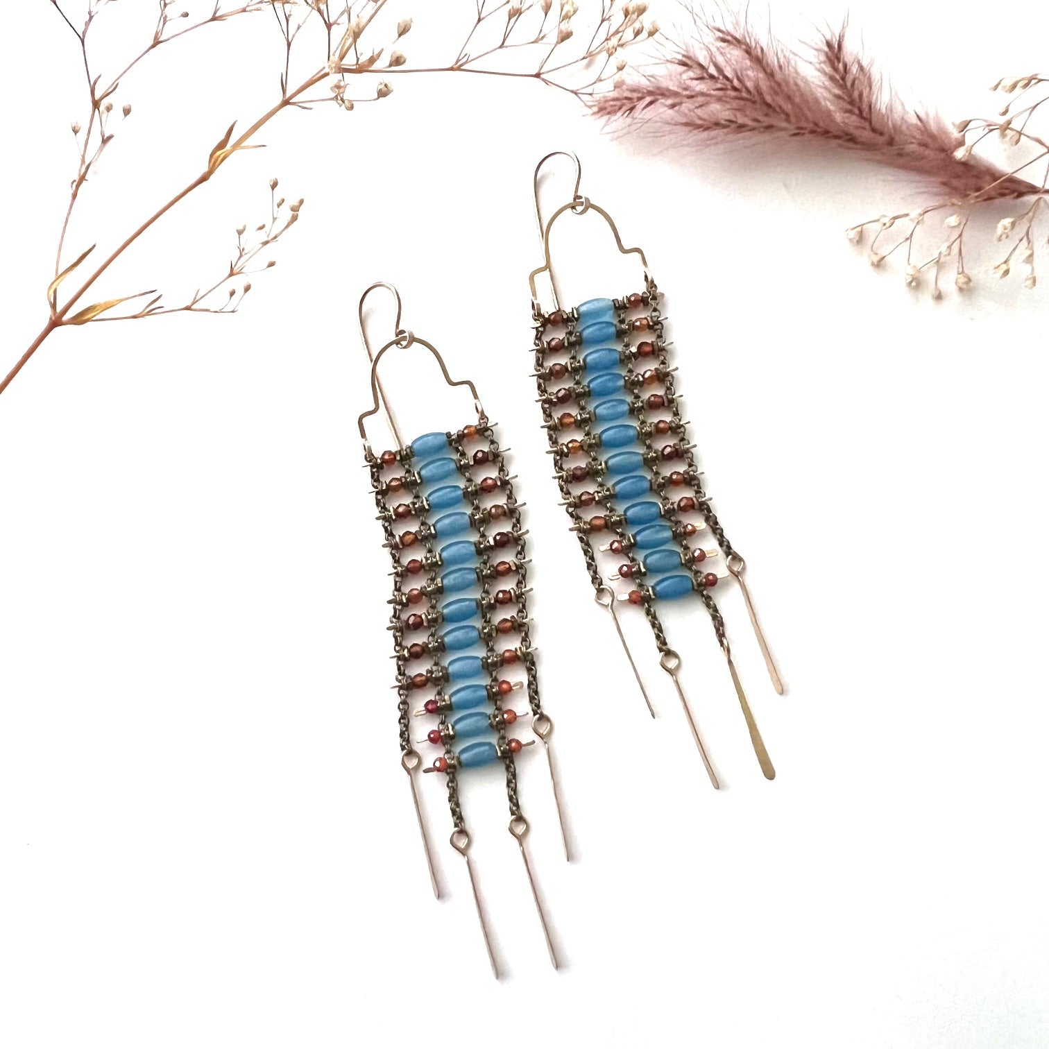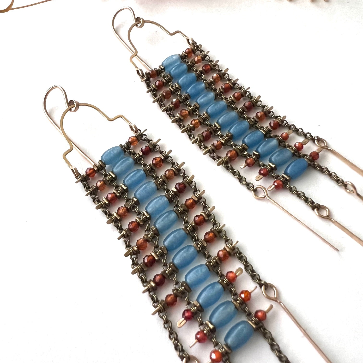 Fiery Carnelian and Blue Onyx beads on antiqued brass chain in the Sky Dancer style. Beautiful earrings with lots of movement and color like an orange sunset with a blue sky. 14k Gold Fill ear wires and arches and hand hammered tassels.